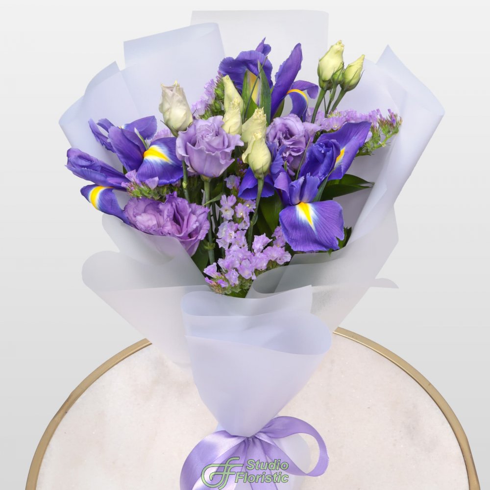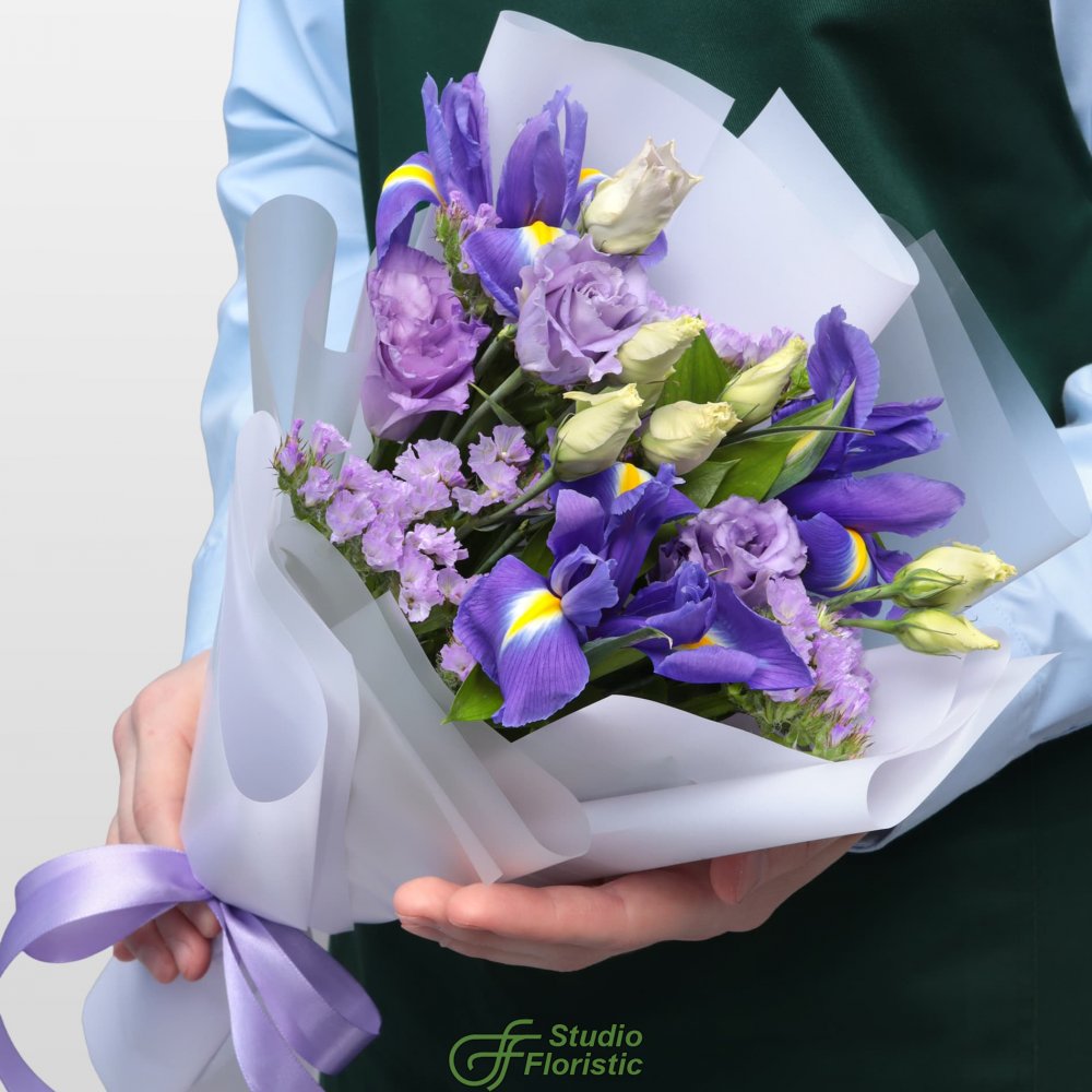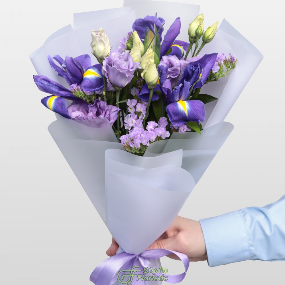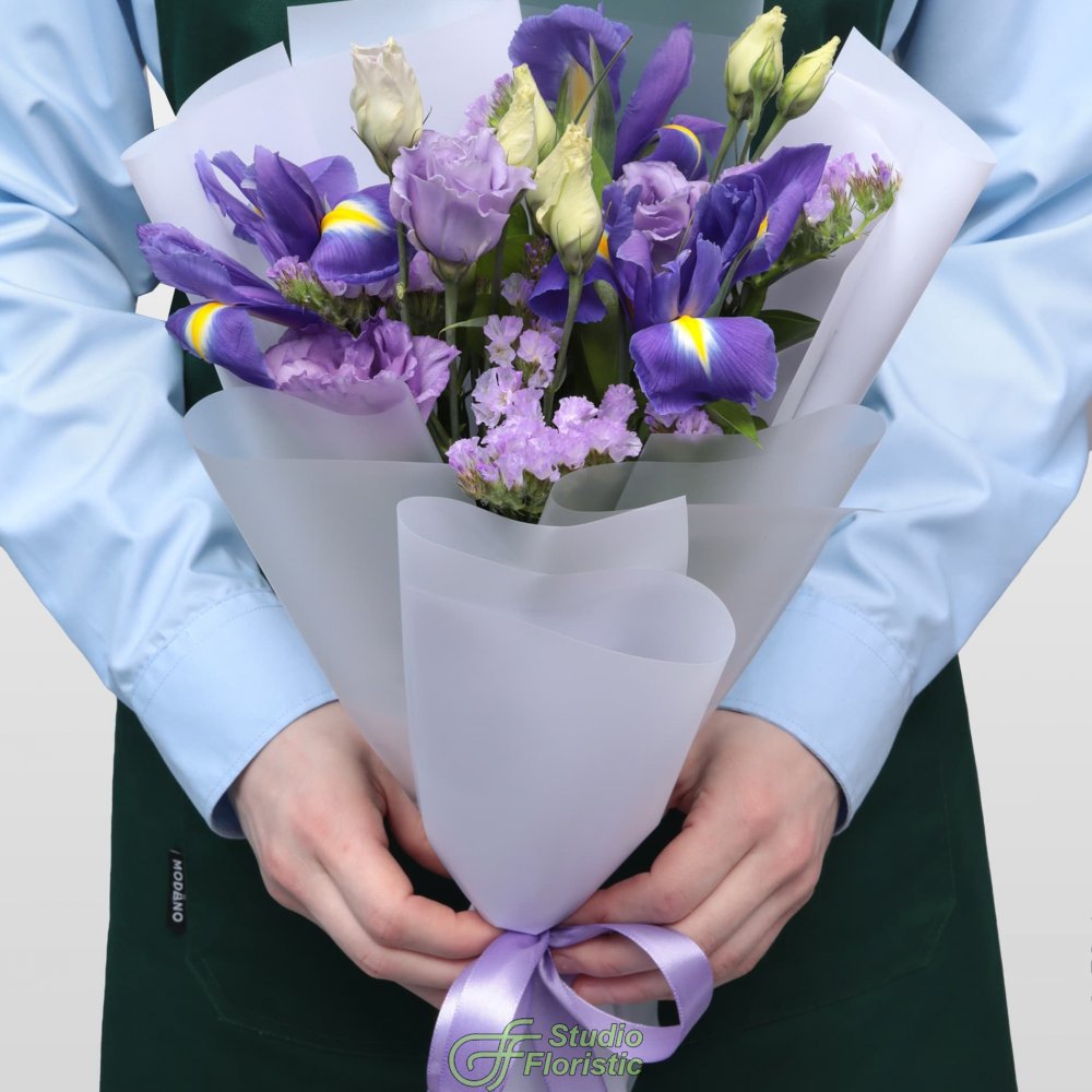 Ирис (3шт.); Эустома (1шт.); Статица (1шт.); Зелень; Упаковка; Атласная лента | 1699 | 2699 |