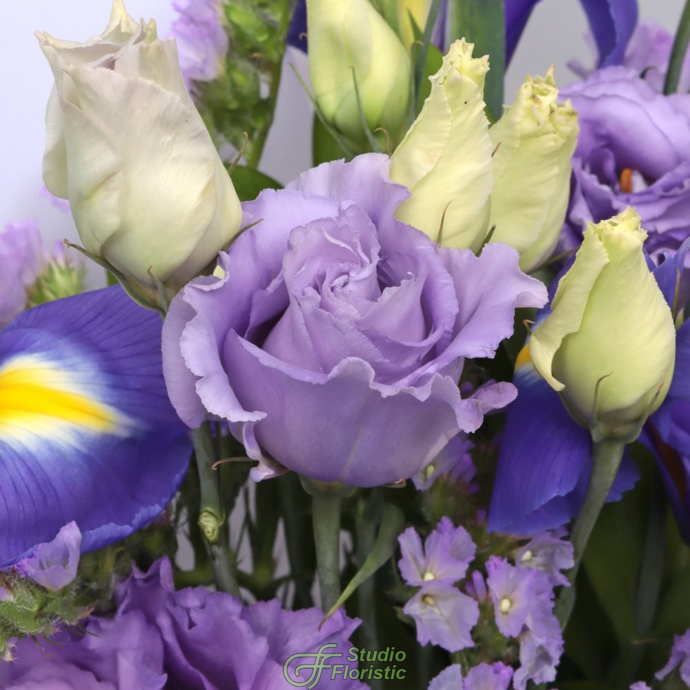 Ирис (3шт.); Эустома (1шт.); Статица (1шт.); Зелень; Упаковка; Атласная лента | 1349 | 1999 |