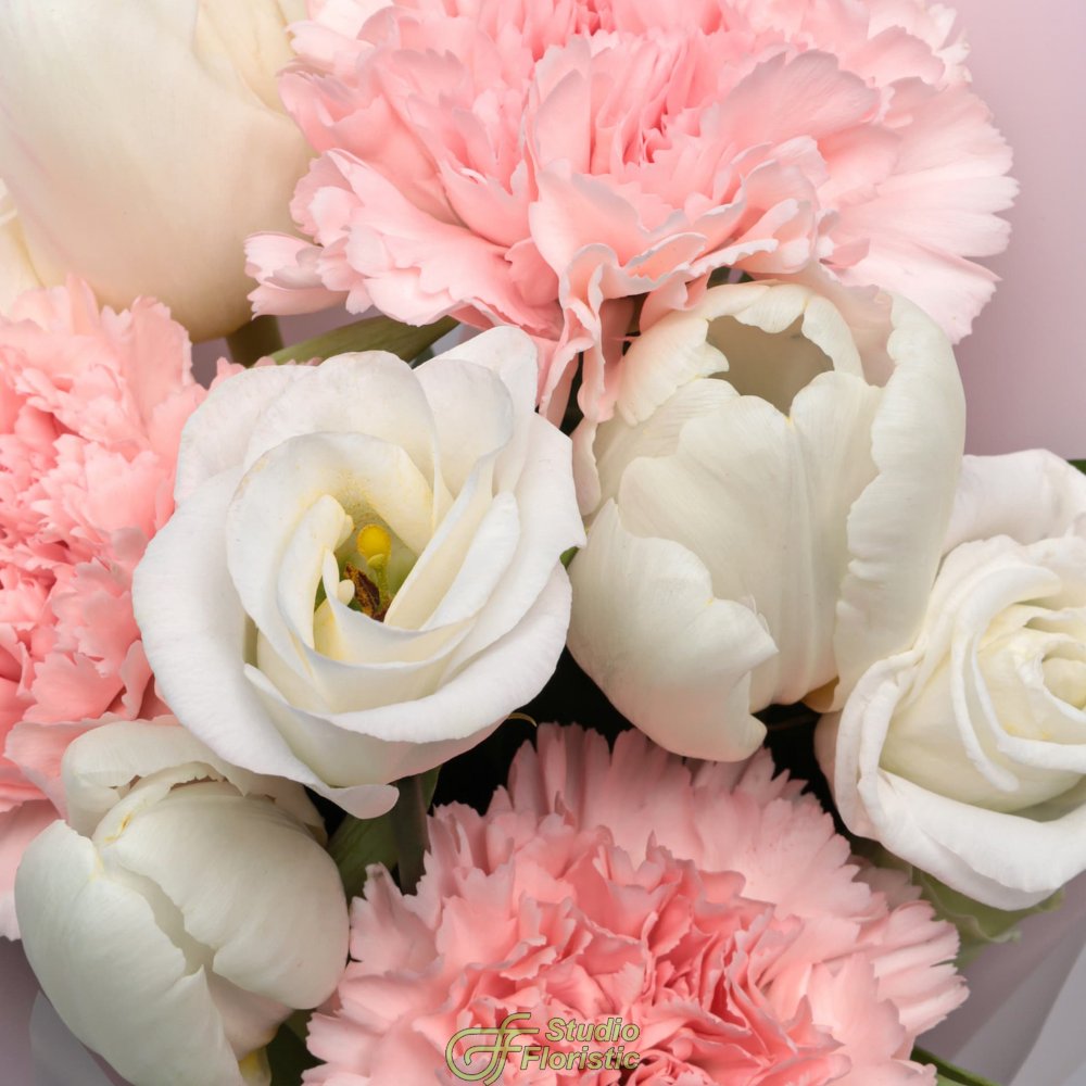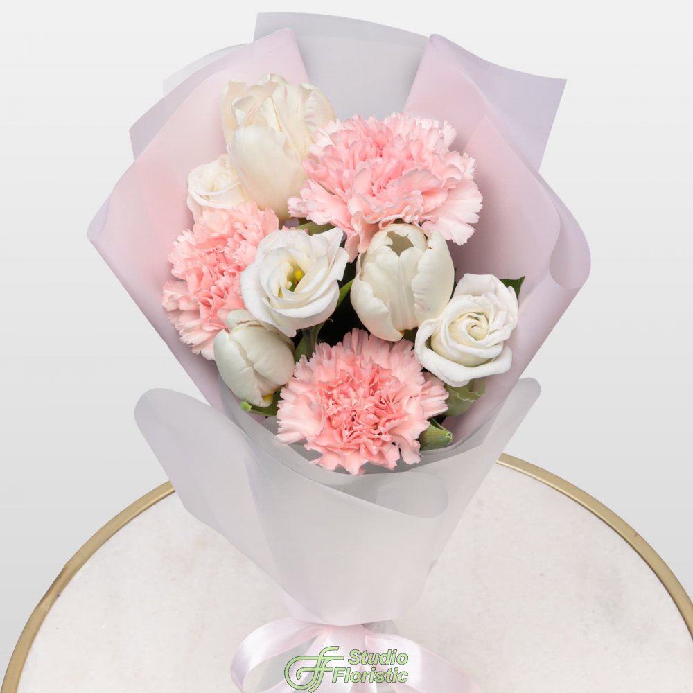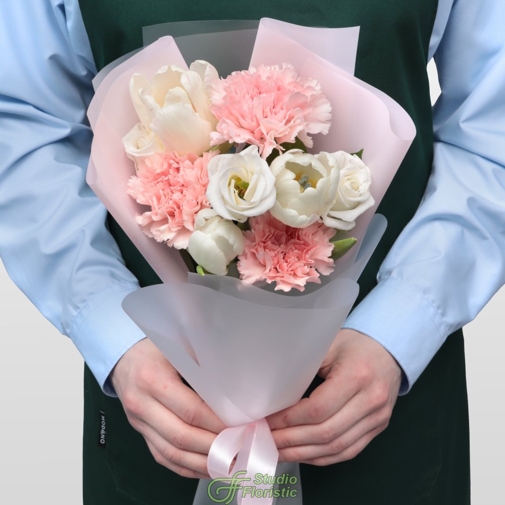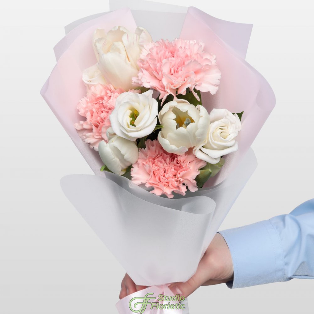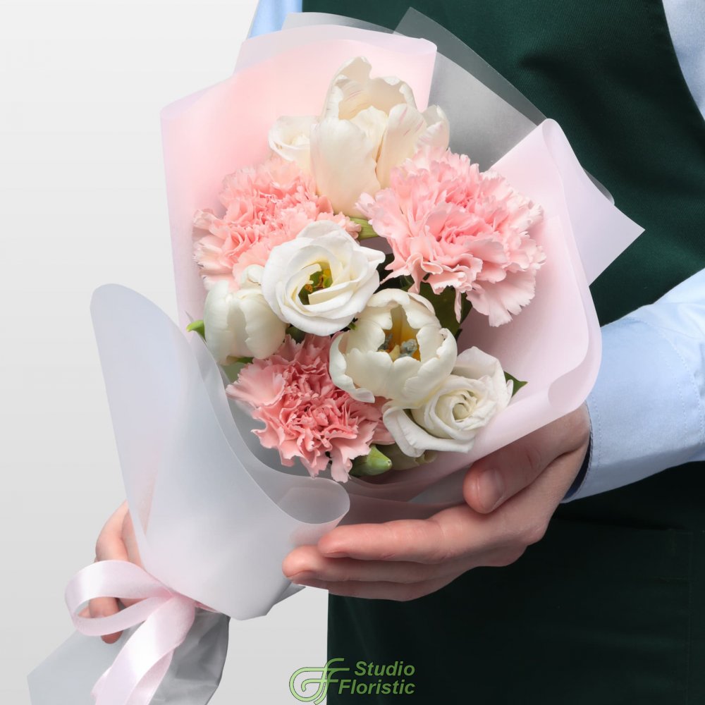 Букет из Гвоздик, Тюльпанов и Эустомы «Маленькая радость»