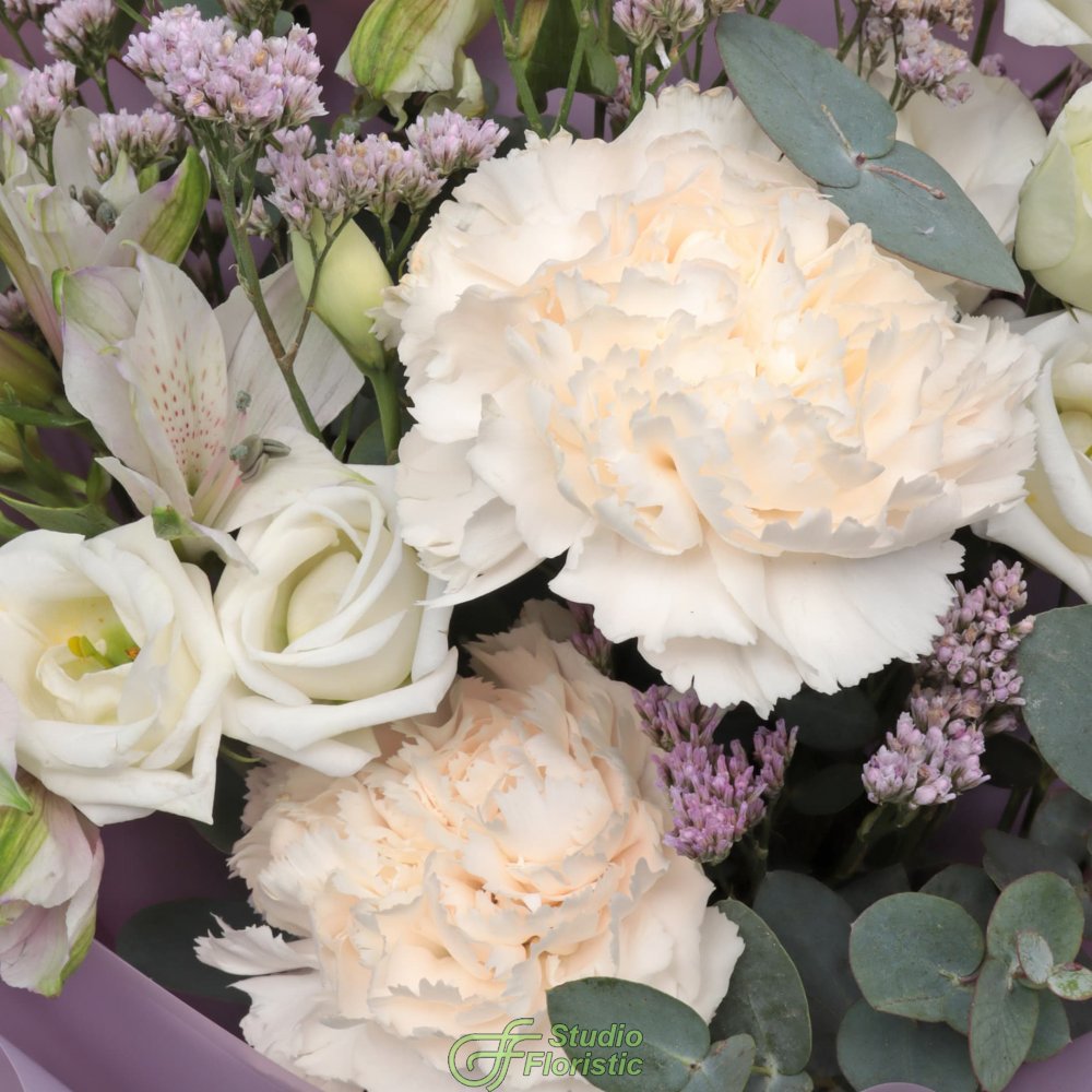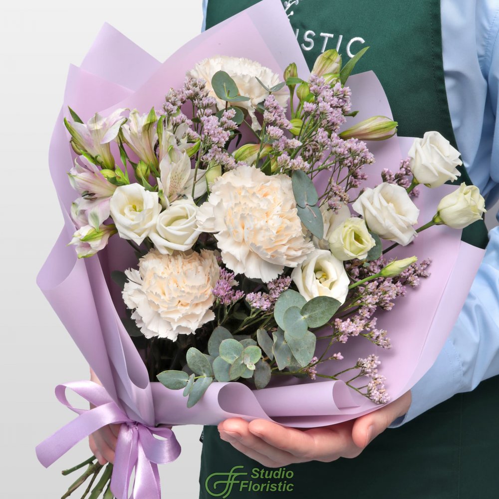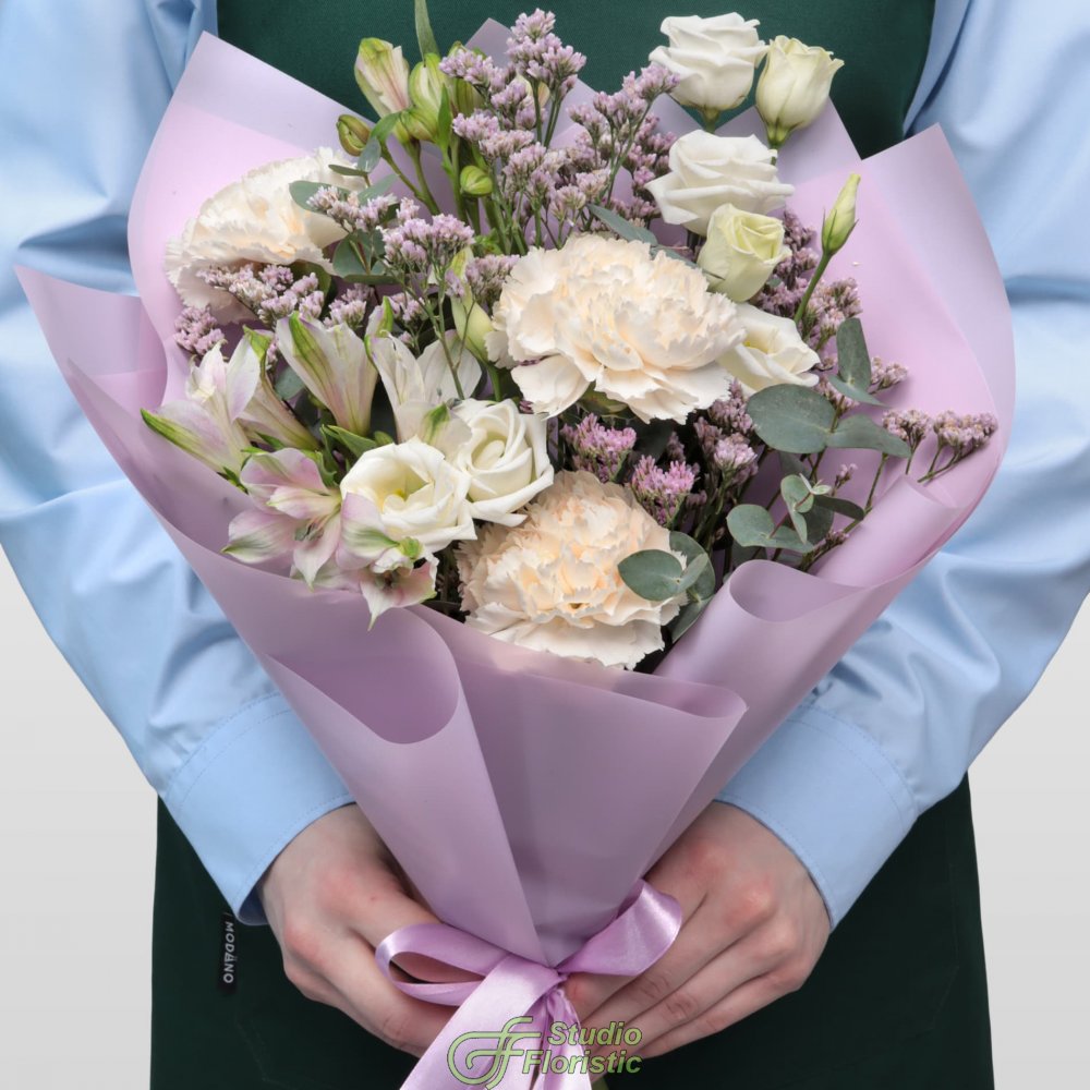 Диантус (3шт.); Альстромерия (1шт.); Лизиантус (1шт.); Лимониум (1шт.); Эвкалипт; Упаковка; Атласная лента | 2999 | 4349 |