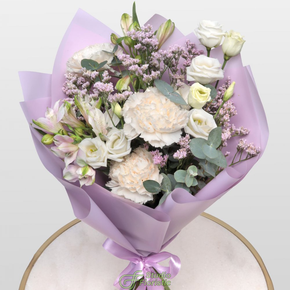 Диантус (3шт.); Альстромерия (1шт.); Лизиантус (1шт.); Лимониум (1шт.); Эвкалипт; Упаковка; Атласная лента | 2699 | 3899 |