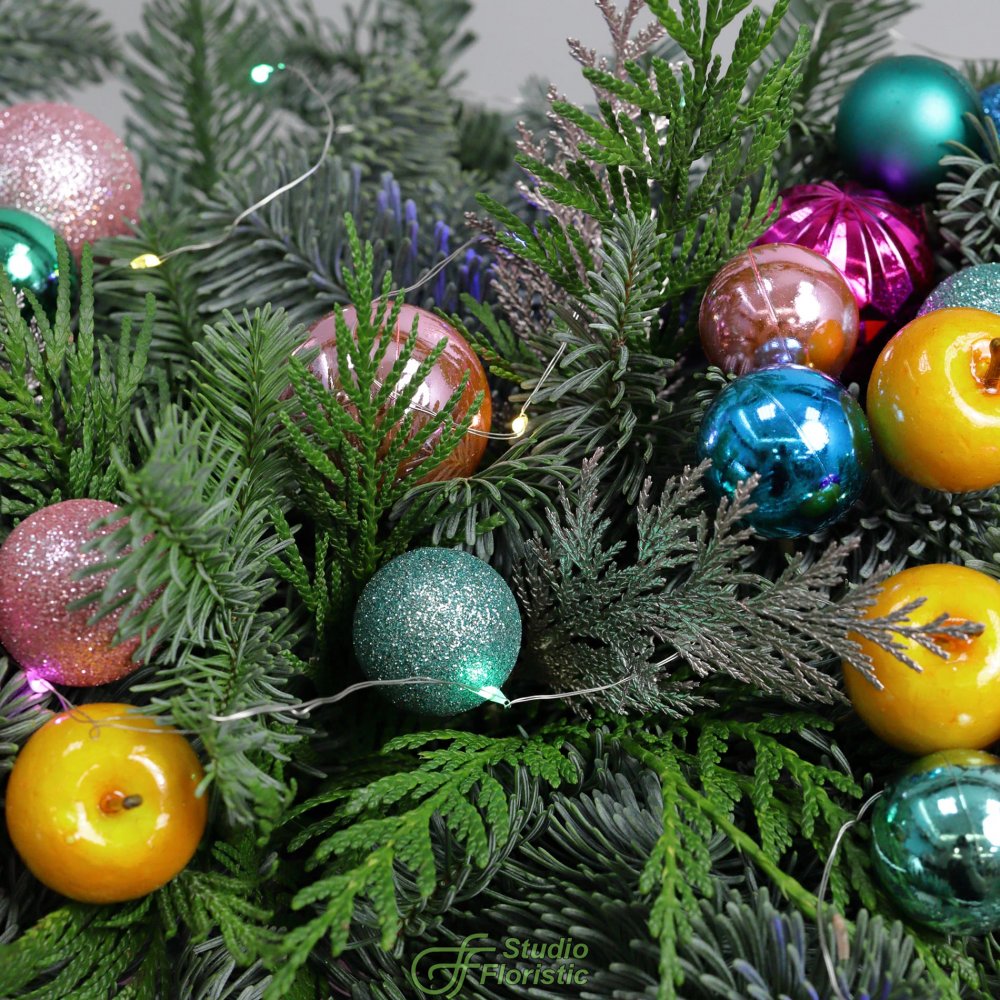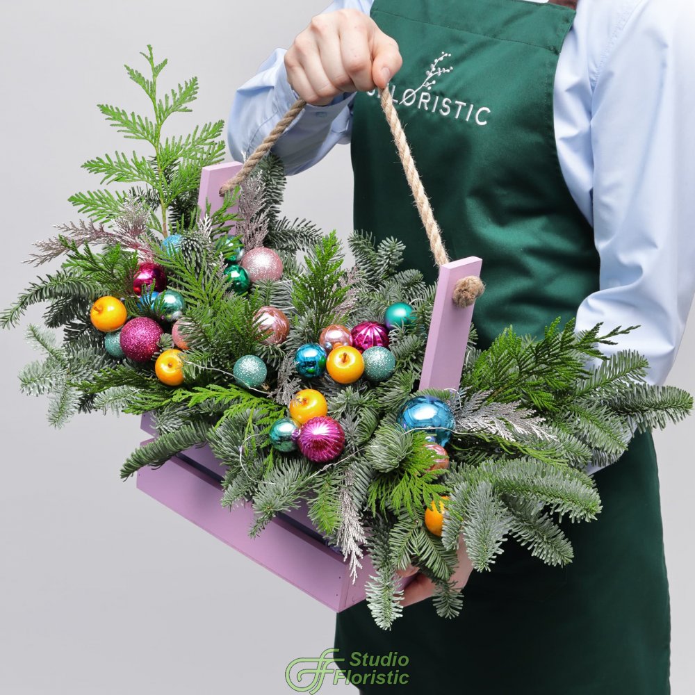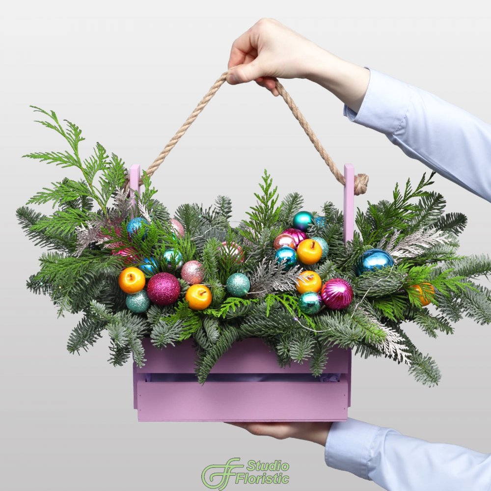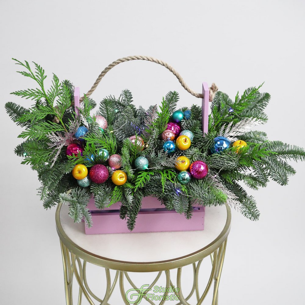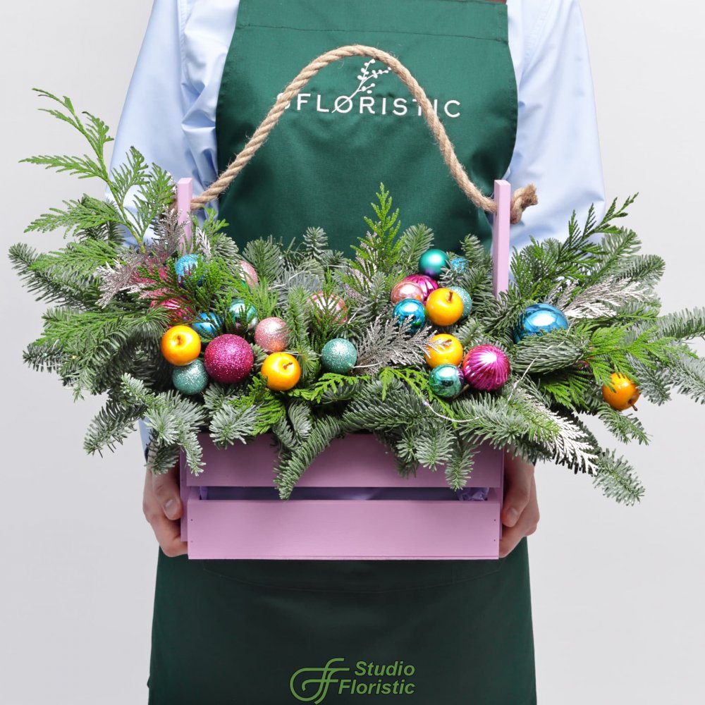 Новогодняя композиция из Нобилиса и Туи в ящике «Тутти-фрутти»