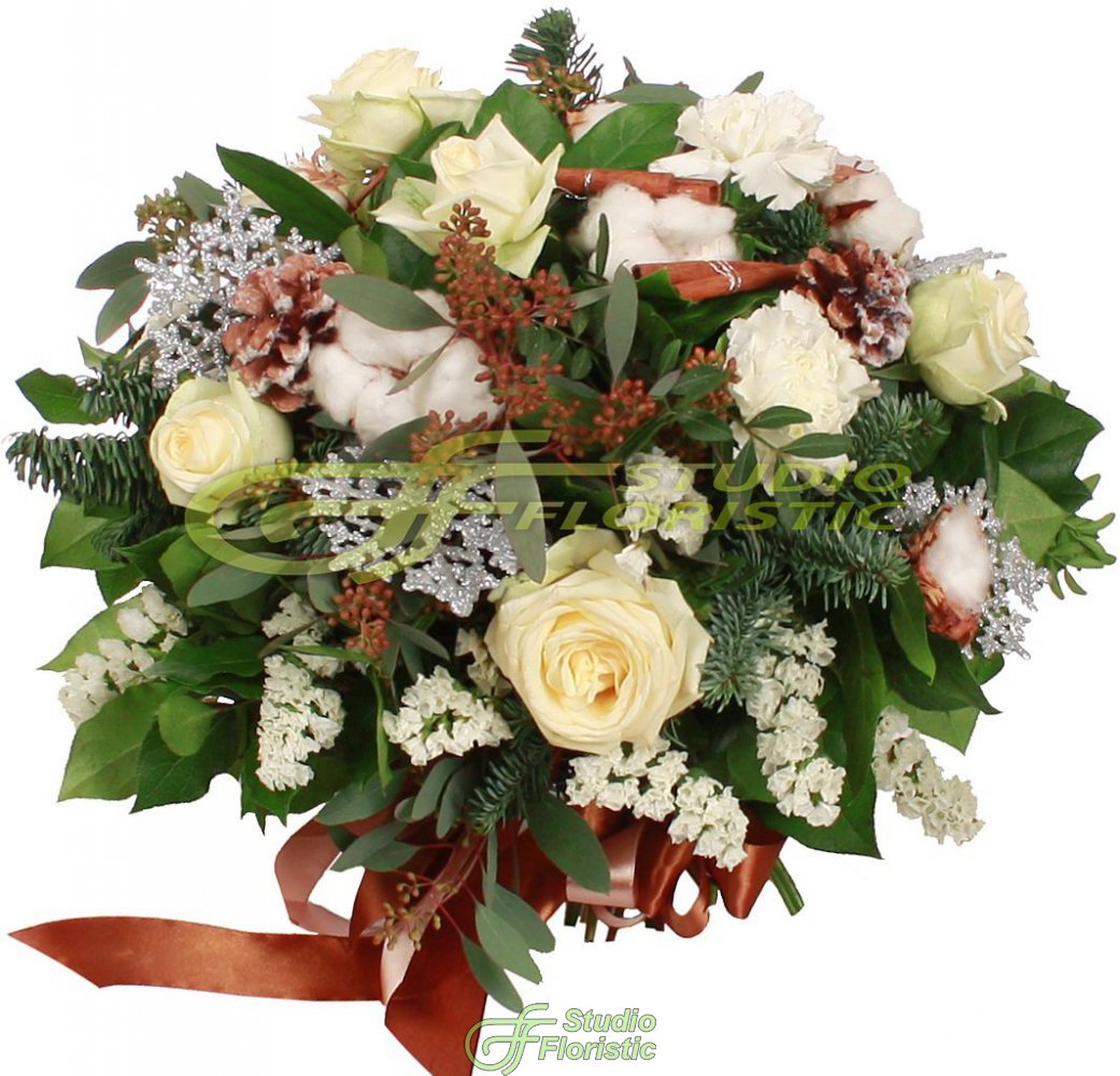 Букет новогодний из Роз, Гвоздик и Хлопка «Морозное утро»