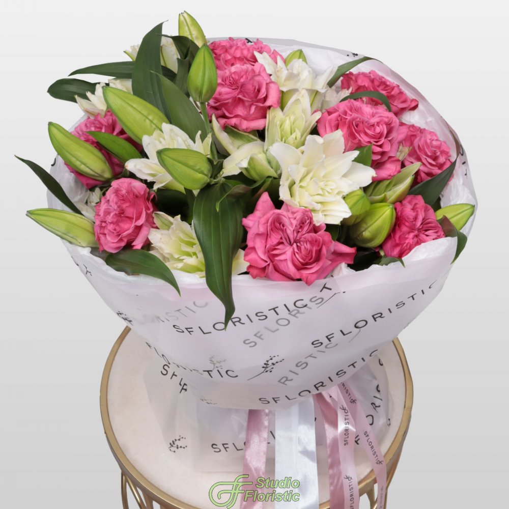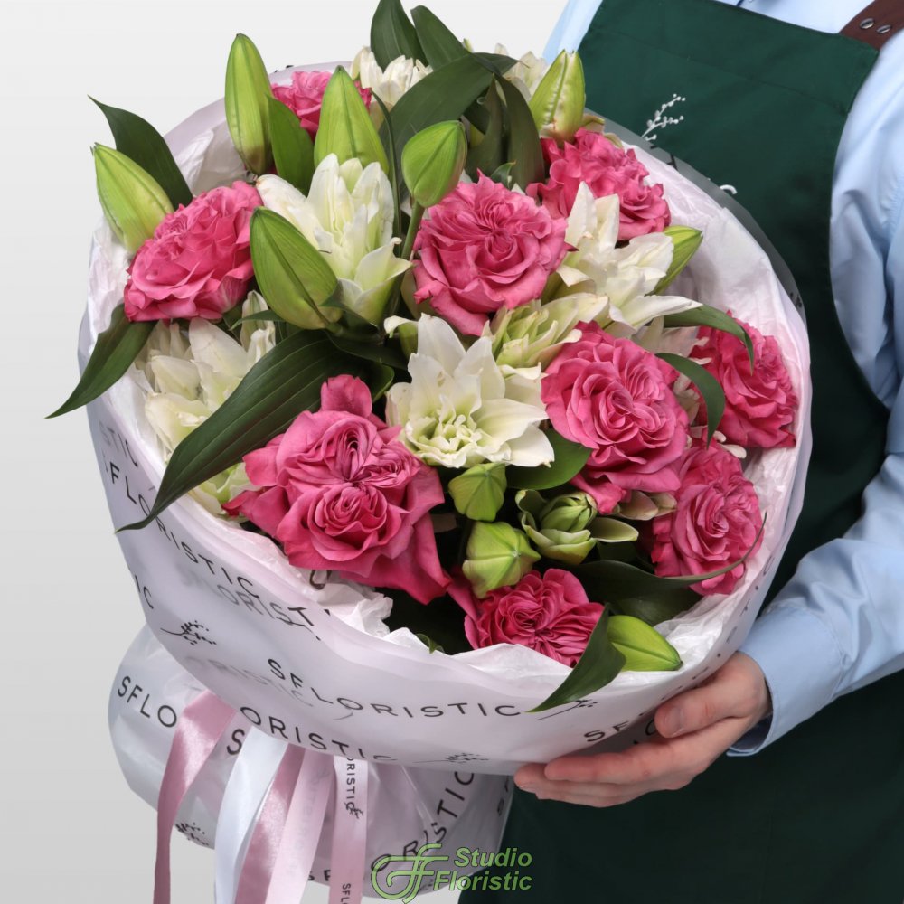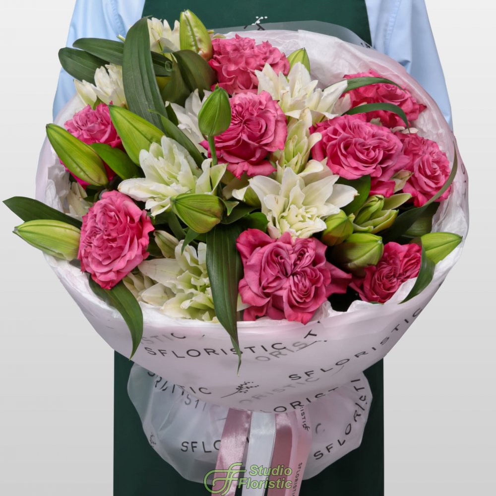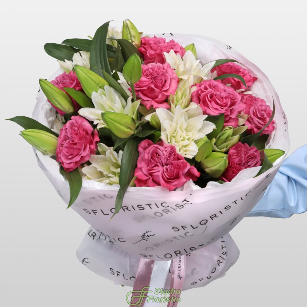 Лилия пионовидная (8шт.); Роза пионовидная Кантри Блюз (15шт.); Матовая пленка; Бумага тишью; Атласная лента (3шт.) | 13999 | |