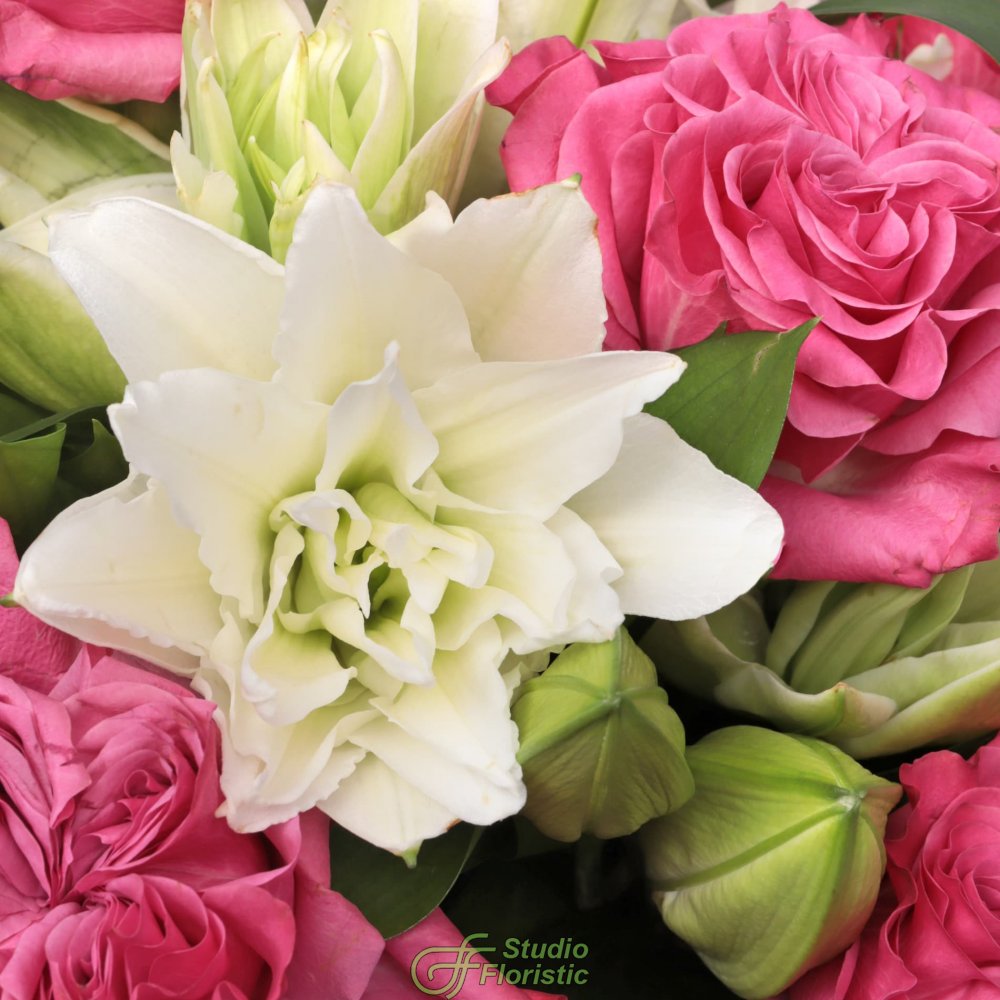 Лилия пионовидная (6шт.); Роза пионовидная Кантри Блюз (9шт.); Матовая пленка; Бумага тишью; Атласная лента (3шт.) | 10299 | |