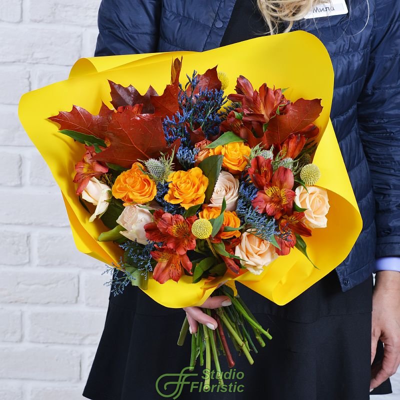 Роза Кения (7шт.); Лимониум (1шт.); Альстромерия (2шт.); Краспедия (2шт.); Эрингиум (1шт.); Листья дуба; Упаковка | 2949 | 4299 |