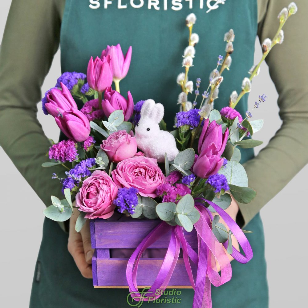 Пасхальная композиция из Тюльпанов, Роз и Вербы «Лавандовый зайка»