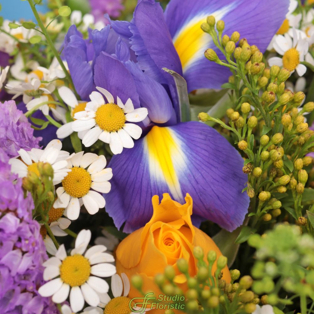 Ромашка (4шт.); Роза Кения 40 см (4шт.); Ирис (3шт.); Тласпи (2шт.); Солидаго (1шт.); Статица (1шт.); Матовая пленка; Атласная лента | 2099 | 3349 |