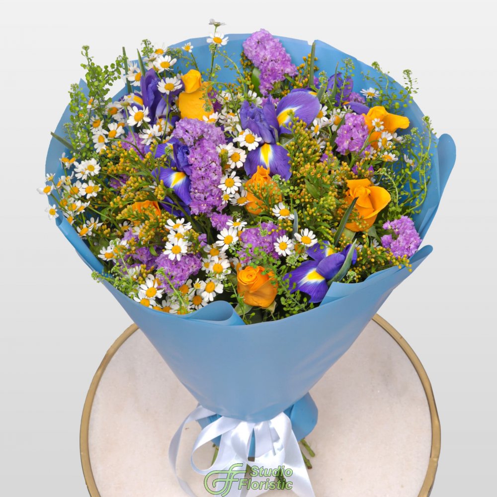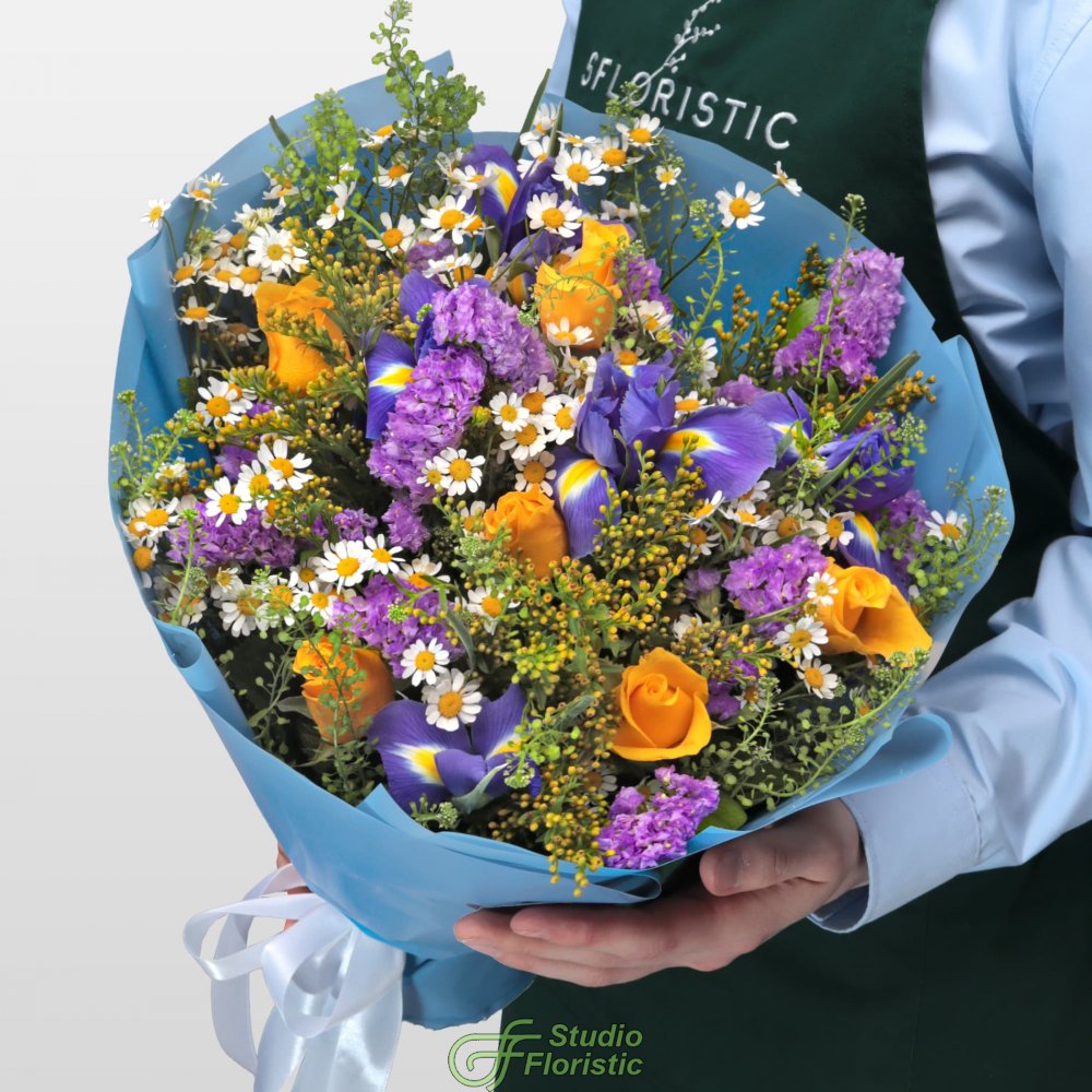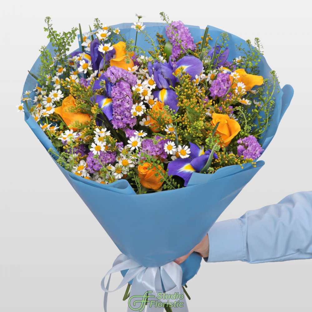 Ромашка (8шт.); Роза Кения 40 см (8шт.); Ирис (6шт.); Тласпи (4шт.); Солидаго (4шт.); Статица (3шт.); Матовая пленка; Атласная лента | 5199 | 8299 |
