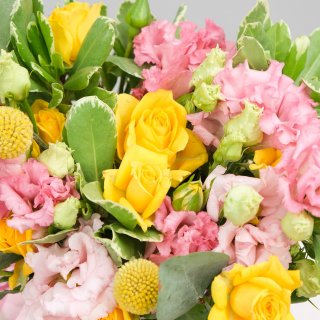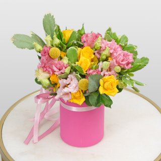 Кустовая Роза (2шт.); Эустома (4шт.); Краспедия (4шт.); Питоспорум (4шт.); Шляпная коробка; Атласная лента | 3649 | 5449 |