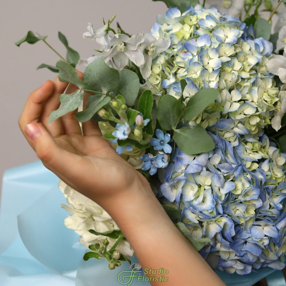 Гортензия (2шт.); Дельфиниум (2шт.); Оксипеталум (3шт.); Эвкалипт; Упаковка | 3399 | |