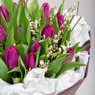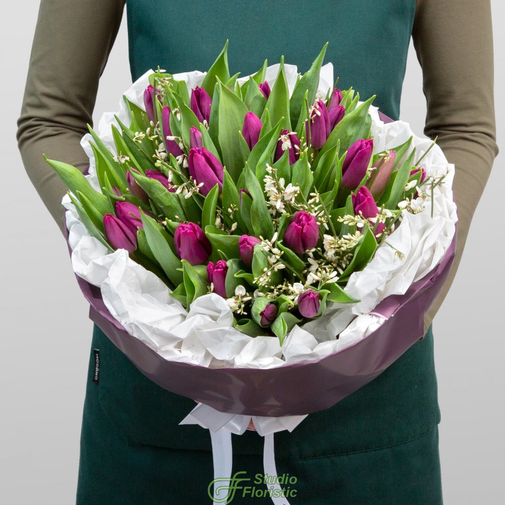 Тюльпан (51шт.); Гениста (3шт.); Тишью; Матовая плёнка; Атласная лента | 7699 | 12299 |